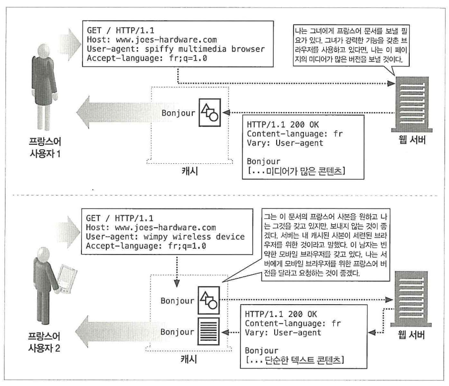 서버는 응답 시 Vary: User-Agent, Accept-Language와 같이 이 응답은 이 헤더들에 따라 달라진다. 라고 알려줌