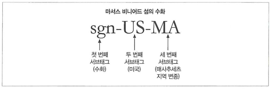 언어 태그의 구조: 언어 태그는 하이픈으로 구분된 하나 이상의 '서브태그'로 구성된다.