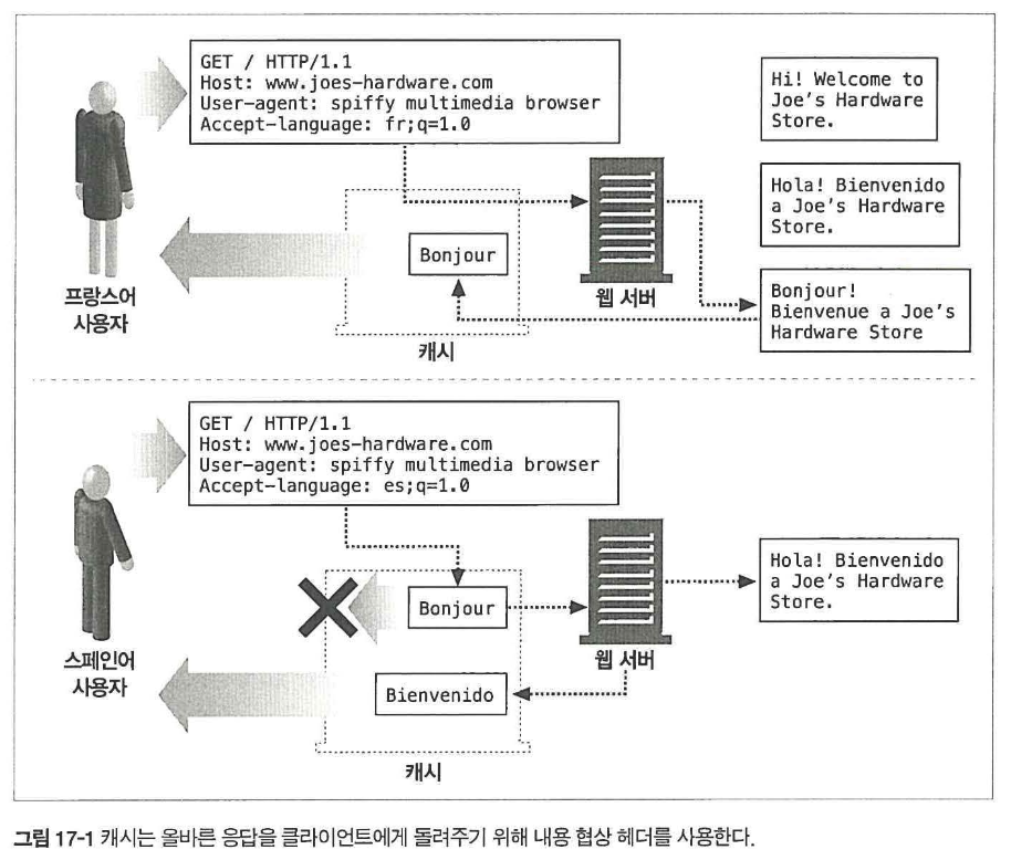 따라서 캐시는 첫 응답뿐 아니라 이후의 모든 다른 버전도 저장해두고, 요청자가 스페인어를 원하면 스페인어 문서를 주는 식으로 요청 조건에 맞는 올바른 얼터네이트를 선택해 전달해야 함